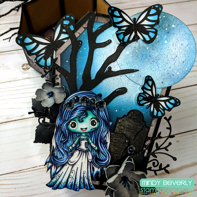 Hello Everyone! Today I am excited to share with you a Ghost Bride Coffin Trinket Box that I created for inspiration this week featuring one of the Gorgeous Witch Clear Stamps from the Hocus Pocus Grab and Go Box from Stamp Anniething. I just Love these super Adorable witch stamps included in the box and how they can be colored in different color combinations to fit so many different Halloween themes and projects! By just coloring this cutie up in different color combos, and adding a few dress details, I was able to create my Spooktastic Ghost Bride!